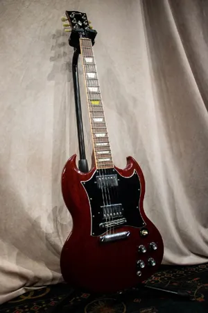 SG Standardは、ギブソンを代表するモデルのひとつとして知られ、軽量なボディと高い演奏性が特徴のエレキギターです。中音域に芯のあるサウンドと鋭いレスポンスを備えており、ロックを中心に幅広いジャンルで使用されています。