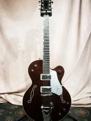 G6119は、グレッチの定番ラインナップのひとつで、セミアコとは異なるフルアコ構造ならではの豊かな箱鳴りと、煌びやかで温かみのあるトーンが魅力です。中古市場でも根強い人気を誇ります。